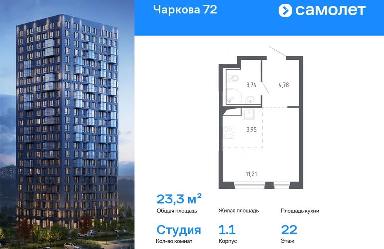 Предлагается квартира студия комфорт-класса 23,3 кв.м в корпусе 1.1 на 22 этаже, в ЖК «Чаркова 72» Квартира без отделки. Доступность опции "отделка" и возможность комплектации мебелью и декором уточняйте у застройщика. Приобрести квартиру возможно по специальным акциям от застройщика, с текущими условиями акций можно ознакомиться в блоке “Акций”. Цена динамическая и может отличаться, уточняйте актуальность у застройщика. Идеальное сочетание городского комфорта и размеренной жизни — квартал «Чаркова 72» на северо-востоке города. В дизайне 17-24-этажных домов с панорамными балконами нашли отражение нотки сибирской природы. От «Чаркова 72» удобно добираться до центра города — всего 17 минут пути. А в 2 минутах от дома находится Тобольский тракт. Для семейного отдыха отлично подойдет парк Гагарина — он находится в 7 минутах от квартала. В закрытых дворах тихо и уютно — все авто остались на одном из 4 многоуровневых паркингов, которые находятся за территорией квартала. Можно спокойно гулять по бульвару и заниматься йогой на спортивной площадке. На первых этажах домов — кафе и магазины. Рядом с проектом — детские сады и школы, городская поликлиника и МФЦ. Во всех квартирах есть выводы под кондиционеры, на подземных этажах — индивидуальные кладовые, на первых — места для хранения велосипедов и колясок. В квартирах можно выбрать варианты отделки: чистовая, черновая и улучшенная из материалов повышенного класса.#yan19-2r1660820#О застройщике