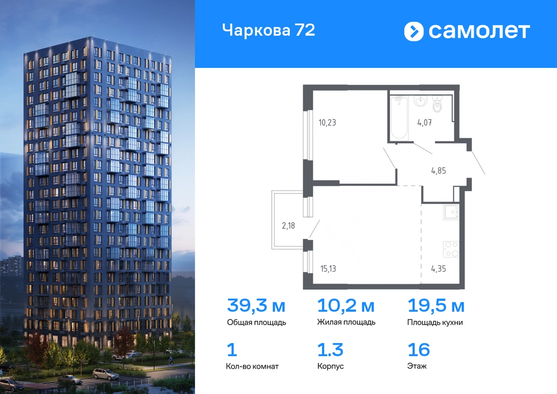 Строим кварталы для жизни с заботой о будущем. Предлагается 1-комнатная квартира комфорт-класса 39,28 кв.м в корпусе 1.3 на 16 этаже, в ЖК «Чаркова 72» Квартира с предчистовой отделкой. Доступность дополнительных опций уточняйте у застройщика. Приобрести квартиру возможно по специальным акциям от застройщика, с текущими условиями акций можно ознакомиться в блоке «Акций». Цена динамическая и может отличаться, уточняйте актуальность у застройщика. Идеальное сочетание городского комфорта и размеренной жизни — квартал «Чаркова 72» на северо-востоке города. В дизайне 17-24-этажных домов с панорамными балконами нашли отражение нотки сибирской природы. От «Чаркова 72» удобно добираться до центра города — всего 17 минут пути. А в 2 минутах от дома находится Тобольский тракт. Для семейного отдыха отлично подойдет парк Гагарина — он находится в 7 минутах от квартала. В закрытых дворах тихо и уютно — все авто остались на одном из 4 многоуровневых паркингов, которые находятся за территорией квартала. Можно спокойно гулять по бульвару и заниматься йогой на спортивной площадке. На первых этажах домов — кафе и магазины. Рядом с проектом — детские сады и школы, городская поликлиника и МФЦ. Во всех квартирах есть выводы под кондиционеры, на подземных этажах — индивидуальные кладовые, на первых — места для хранения велосипедов и колясок. В квартирах можно выбрать варианты отделки: чистовая, черновая и улучшенная из материалов повышенного класса.#yan19-2r1665260#О застройщике