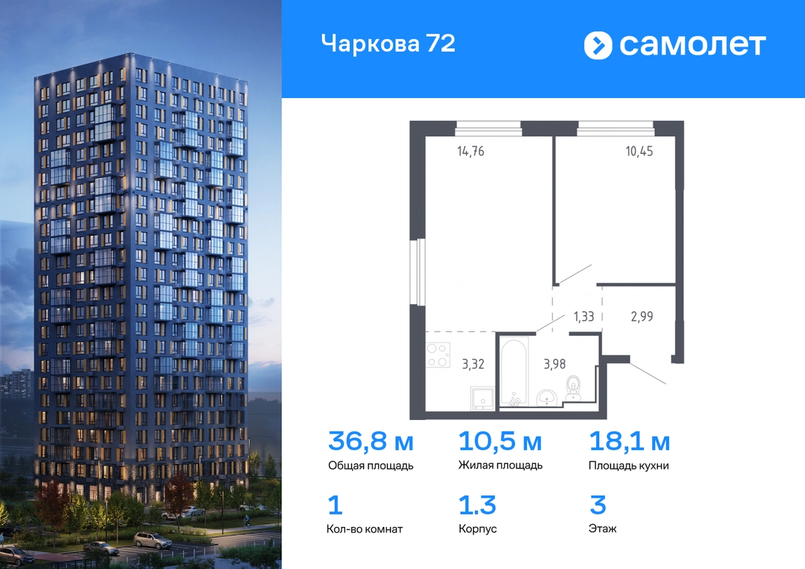 Строим кварталы для жизни с заботой о будущем. Предлагается 1-комнатная квартира комфорт-класса 36,83 кв.м в корпусе 1.3 на 3 этаже, в ЖК «Чаркова 72» Квартира с предчистовой отделкой. Доступность дополнительных опций уточняйте у застройщика. Приобрести квартиру возможно по специальным акциям от застройщика, с текущими условиями акций можно ознакомиться в блоке «Акций». Цена динамическая и может отличаться, уточняйте актуальность у застройщика. Идеальное сочетание городского комфорта и размеренной жизни — квартал «Чаркова 72» на северо-востоке города. В дизайне 17-24-этажных домов с панорамными балконами нашли отражение нотки сибирской природы. От «Чаркова 72» удобно добираться до центра города — всего 17 минут пути. А в 2 минутах от дома находится Тобольский тракт. Для семейного отдыха отлично подойдет парк Гагарина — он находится в 7 минутах от квартала. В закрытых дворах тихо и уютно — все авто остались на одном из 4 многоуровневых паркингов, которые находятся за территорией квартала. Можно спокойно гулять по бульвару и заниматься йогой на спортивной площадке. На первых этажах домов — кафе и магазины. Рядом с проектом — детские сады и школы, городская поликлиника и МФЦ. Во всех квартирах есть выводы под кондиционеры, на подземных этажах — индивидуальные кладовые, на первых — места для хранения велосипедов и колясок. В квартирах можно выбрать варианты отделки: чистовая, черновая и улучшенная из материалов повышенного класса.#yan19-2r1665784#О застройщике