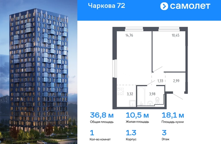 Строим кварталы для жизни с заботой о будущем. Предлагается 1-комнатная квартира комфорт-класса 36,83 кв.м в корпусе 1.3 на 3 этаже, в ЖК «Чаркова 72» Квартира с предчистовой отделкой. Доступность дополнительных опций уточняйте у застройщика. Приобрести квартиру возможно по специальным акциям от застройщика, с текущими условиями акций можно ознакомиться в блоке «Акций». Цена динамическая и может отличаться, уточняйте актуальность у застройщика. Идеальное сочетание городского комфорта и размеренной жизни — квартал «Чаркова 72» на северо-востоке города. В дизайне 17-24-этажных домов с панорамными балконами нашли отражение нотки сибирской природы. От «Чаркова 72» удобно добираться до центра города — всего 17 минут пути. А в 2 минутах от дома находится Тобольский тракт. Для семейного отдыха отлично подойдет парк Гагарина — он находится в 7 минутах от квартала. В закрытых дворах тихо и уютно — все авто остались на одном из 4 многоуровневых паркингов, которые находятся за территорией квартала. Можно спокойно гулять по бульвару и заниматься йогой на спортивной площадке. На первых этажах домов — кафе и магазины. Рядом с проектом — детские сады и школы, городская поликлиника и МФЦ. Во всех квартирах есть выводы под кондиционеры, на подземных этажах — индивидуальные кладовые, на первых — места для хранения велосипедов и колясок. В квартирах можно выбрать варианты отделки: чистовая, черновая и улучшенная из материалов повышенного класса.#yan19-2r1665784#О застройщике