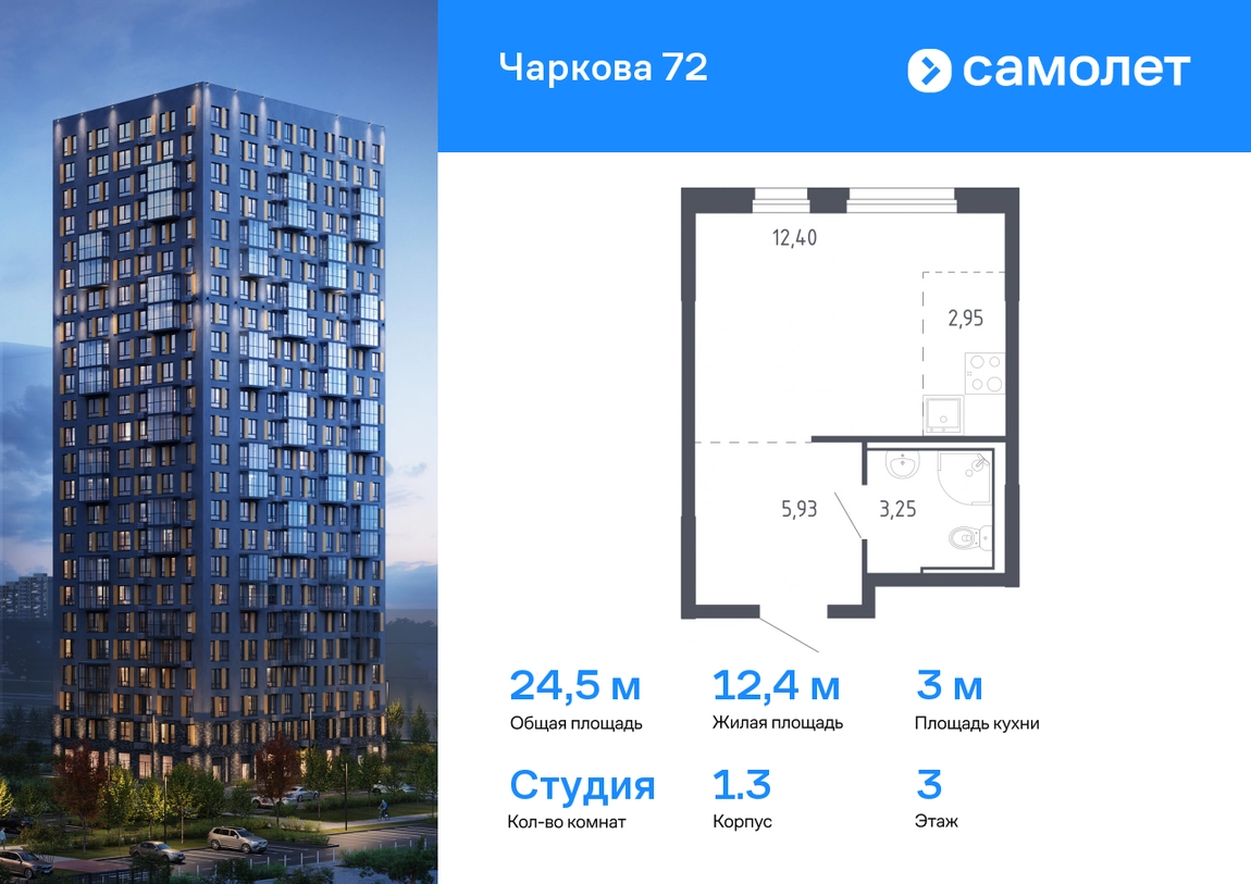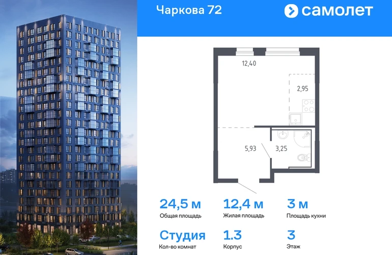 Строим кварталы для жизни с заботой о будущем. Предлагается квартира студия комфорт-класса 24,53 кв.м в корпусе 1.3 на 3 этаже, в ЖК «Чаркова 72» Квартира с предчистовой отделкой. Доступность дополнительных опций уточняйте у застройщика. Приобрести квартиру возможно по специальным акциям от застройщика, с текущими условиями акций можно ознакомиться в блоке «Акций». Цена динамическая и может отличаться, уточняйте актуальность у застройщика. Идеальное сочетание городского комфорта и размеренной жизни — квартал «Чаркова 72» на северо-востоке города. В дизайне 17-24-этажных домов с панорамными балконами нашли отражение нотки сибирской природы. От «Чаркова 72» удобно добираться до центра города — всего 17 минут пути. А в 2 минутах от дома находится Тобольский тракт. Для семейного отдыха отлично подойдет парк Гагарина — он находится в 7 минутах от квартала. В закрытых дворах тихо и уютно — все авто остались на одном из 4 многоуровневых паркингов, которые находятся за территорией квартала. Можно спокойно гулять по бульвару и заниматься йогой на спортивной площадке. На первых этажах домов — кафе и магазины. Рядом с проектом — детские сады и школы, городская поликлиника и МФЦ. Во всех квартирах есть выводы под кондиционеры, на подземных этажах — индивидуальные кладовые, на первых — места для хранения велосипедов и колясок. В квартирах можно выбрать варианты отделки: чистовая, черновая и улучшенная из материалов повышенного класса.#yan19-2r1665787#О застройщике