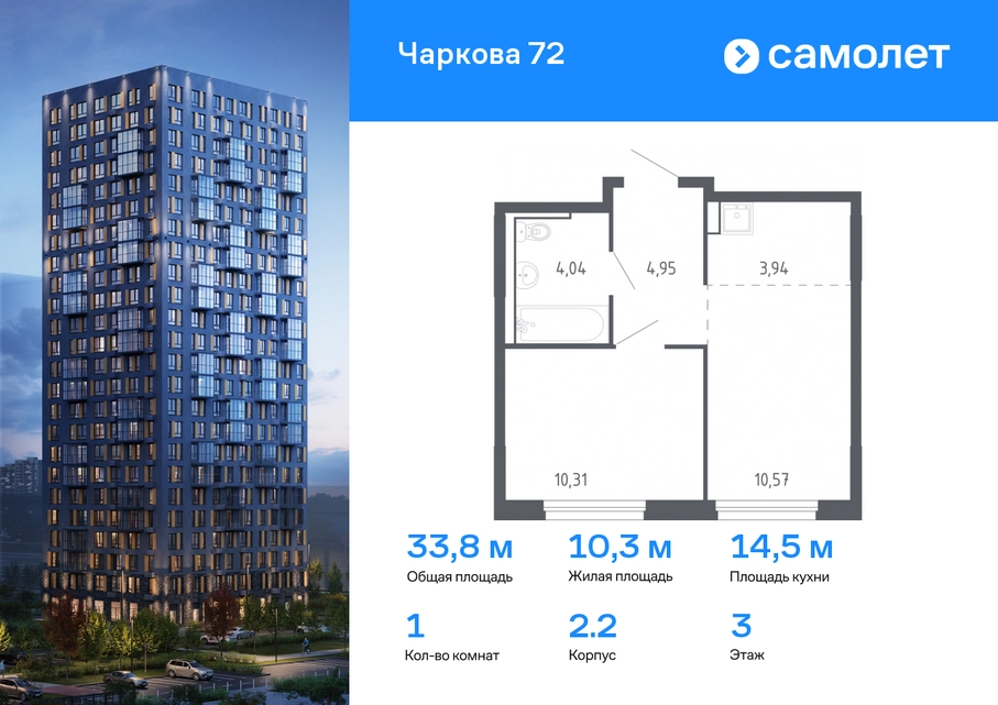 Строим кварталы для жизни с заботой о будущем. Предлагается 1-комнатная квартира комфорт-класса 33,81 кв.м в корпусе 2.2 на 3 этаже, в ЖК «Чаркова 72» Квартира с предчистовой отделкой. Доступность дополнительных опций уточняйте у застройщика. Приобрести квартиру возможно по специальным акциям от застройщика, с текущими условиями акций можно ознакомиться в блоке «Акций». Цена динамическая и может отличаться, уточняйте актуальность у застройщика. Идеальное сочетание городского комфорта и размеренной жизни — квартал «Чаркова 72» на северо-востоке города. В дизайне 17-24-этажных домов с панорамными балконами нашли отражение нотки сибирской природы. От «Чаркова 72» удобно добираться до центра города — всего 17 минут пути. А в 2 минутах от дома находится Тобольский тракт. Для семейного отдыха отлично подойдет парк Гагарина — он находится в 7 минутах от квартала. В закрытых дворах тихо и уютно — все авто остались на одном из 4 многоуровневых паркингов, которые находятся за территорией квартала. Можно спокойно гулять по бульвару и заниматься йогой на спортивной площадке. На первых этажах домов — кафе и магазины. Рядом с проектом — детские сады и школы, городская поликлиника и МФЦ. Во всех квартирах есть выводы под кондиционеры, на подземных этажах — индивидуальные кладовые, на первых — места для хранения велосипедов и колясок. В квартирах можно выбрать варианты отделки: чистовая, черновая и улучшенная из материалов повышенного класса.#yan19-2r1665805#О застройщике