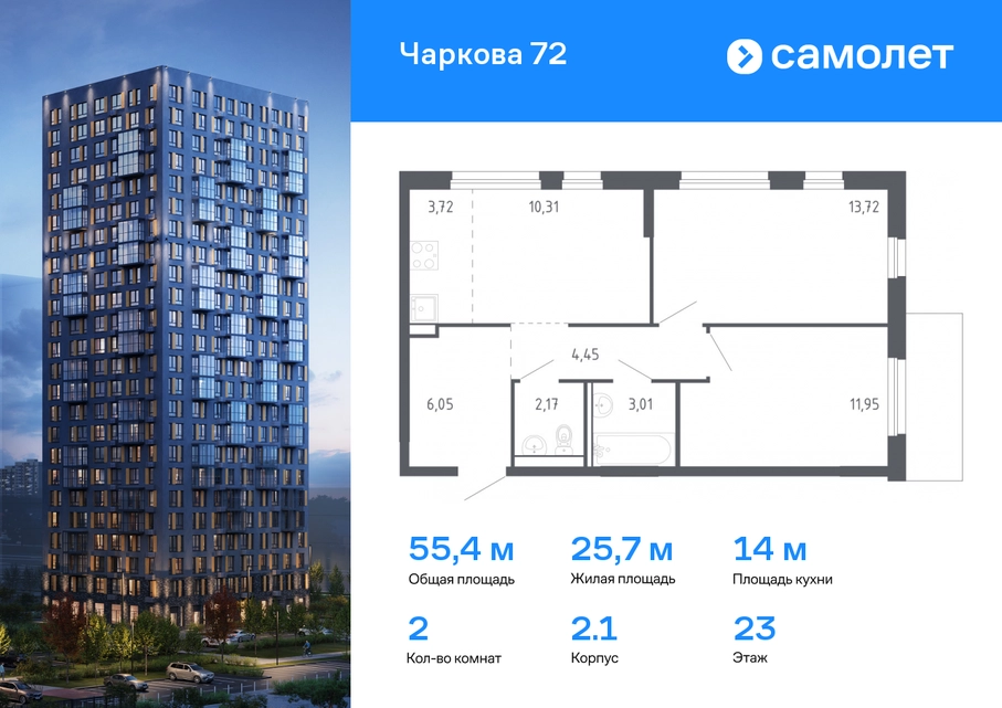 Строим кварталы для жизни с заботой о будущем. Предлагается 2-комнатная квартира комфорт-класса 55,38 кв.м в корпусе 2.1 на 23 этаже, в ЖК «Чаркова 72» Квартира с чистовой отделкой. Доступность дополнительных опций уточняйте у застройщика. Приобрести квартиру возможно по специальным акциям от застройщика, с текущими условиями акций можно ознакомиться в блоке «Акций». Цена динамическая и может отличаться, уточняйте актуальность у застройщика. Идеальное сочетание городского комфорта и размеренной жизни — квартал «Чаркова 72» на северо-востоке города. В дизайне 17-24-этажных домов с панорамными балконами нашли отражение нотки сибирской природы. От «Чаркова 72» удобно добираться до центра города — всего 17 минут пути. А в 2 минутах от дома находится Тобольский тракт. Для семейного отдыха отлично подойдет парк Гагарина — он находится в 7 минутах от квартала. В закрытых дворах тихо и уютно — все авто остались на одном из 4 многоуровневых паркингов, которые находятся за территорией квартала. Можно спокойно гулять по бульвару и заниматься йогой на спортивной площадке. На первых этажах домов — кафе и магазины. Рядом с проектом — детские сады и школы, городская поликлиника и МФЦ. Во всех квартирах есть выводы под кондиционеры, на подземных этажах — индивидуальные кладовые, на первых — места для хранения велосипедов и колясок. В квартирах можно выбрать варианты отделки: чистовая, черновая и улучшенная из материалов повышенного класса.#yan19-2r1667662#О застройщике