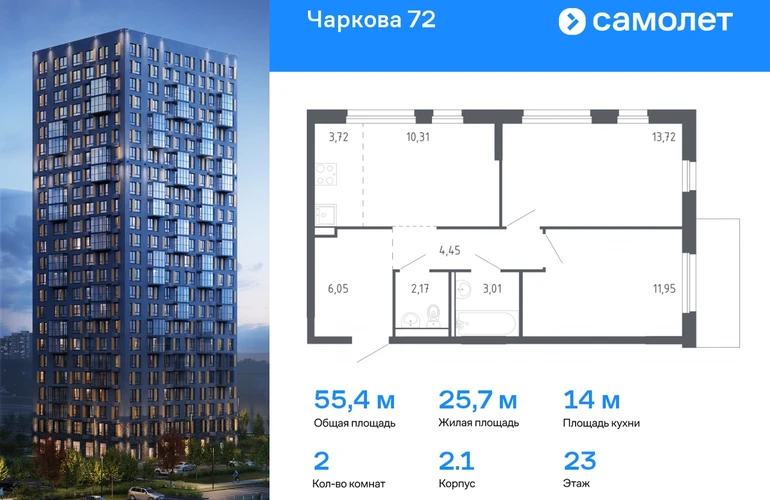 Строим кварталы для жизни с заботой о будущем. Предлагается 2-комнатная квартира комфорт-класса 55,38 кв.м в корпусе 2.1 на 23 этаже, в ЖК «Чаркова 72» Квартира с чистовой отделкой. Доступность дополнительных опций уточняйте у застройщика. Приобрести квартиру возможно по специальным акциям от застройщика, с текущими условиями акций можно ознакомиться в блоке «Акций». Цена динамическая и может отличаться, уточняйте актуальность у застройщика. Идеальное сочетание городского комфорта и размеренной жизни — квартал «Чаркова 72» на северо-востоке города. В дизайне 17-24-этажных домов с панорамными балконами нашли отражение нотки сибирской природы. От «Чаркова 72» удобно добираться до центра города — всего 17 минут пути. А в 2 минутах от дома находится Тобольский тракт. Для семейного отдыха отлично подойдет парк Гагарина — он находится в 7 минутах от квартала. В закрытых дворах тихо и уютно — все авто остались на одном из 4 многоуровневых паркингов, которые находятся за территорией квартала. Можно спокойно гулять по бульвару и заниматься йогой на спортивной площадке. На первых этажах домов — кафе и магазины. Рядом с проектом — детские сады и школы, городская поликлиника и МФЦ. Во всех квартирах есть выводы под кондиционеры, на подземных этажах — индивидуальные кладовые, на первых — места для хранения велосипедов и колясок. В квартирах можно выбрать варианты отделки: чистовая, черновая и улучшенная из материалов повышенного класса.#yan19-2r1667662#О застройщике