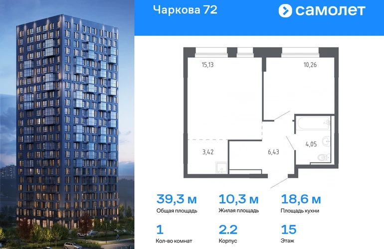 Строим кварталы для жизни с заботой о будущем. Предлагается 1-комнатная квартира комфорт-класса 39,29 кв.м в корпусе 2.2 на 15 этаже, в ЖК «Чаркова 72» Квартира с предчистовой отделкой. Доступность дополнительных опций уточняйте у застройщика. Приобрести квартиру возможно по специальным акциям от застройщика, с текущими условиями акций можно ознакомиться в блоке «Акций». Цена динамическая и может отличаться, уточняйте актуальность у застройщика. Идеальное сочетание городского комфорта и размеренной жизни — квартал «Чаркова 72» на северо-востоке города. В дизайне 17-24-этажных домов с панорамными балконами нашли отражение нотки сибирской природы. От «Чаркова 72» удобно добираться до центра города — всего 17 минут пути. А в 2 минутах от дома находится Тобольский тракт. Для семейного отдыха отлично подойдет парк Гагарина — он находится в 7 минутах от квартала. В закрытых дворах тихо и уютно — все авто остались на одном из 4 многоуровневых паркингов, которые находятся за территорией квартала. Можно спокойно гулять по бульвару и заниматься йогой на спортивной площадке. На первых этажах домов — кафе и магазины. Рядом с проектом — детские сады и школы, городская поликлиника и МФЦ. Во всех квартирах есть выводы под кондиционеры, на подземных этажах — индивидуальные кладовые, на первых — места для хранения велосипедов и колясок. В квартирах можно выбрать варианты отделки: чистовая, черновая и улучшенная из материалов повышенного класса.#yan19-2r1667675#О застройщике