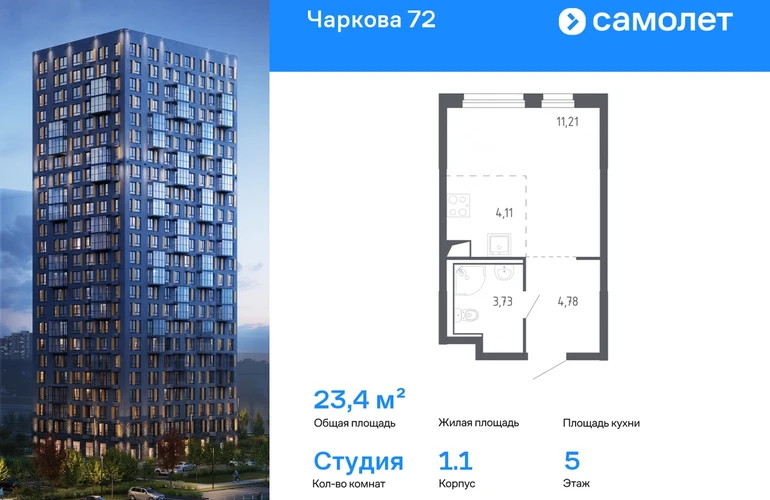 Предлагается квартира студия комфорт-класса 23,4 кв.м в корпусе 1.1 на 5 этаже, в ЖК «Чаркова 72» Квартира с чистовой отделкой. Доступность дополнительных опций уточняйте у застройщика. Приобрести квартиру возможно по специальным акциям от застройщика, с текущими условиями акций можно ознакомиться в блоке «Акций». Цена динамическая и может отличаться, уточняйте актуальность у застройщика. Идеальное сочетание городского комфорта и размеренной жизни — квартал «Чаркова 72» на северо-востоке города. В дизайне 17-24-этажных домов с панорамными балконами нашли отражение нотки сибирской природы. От «Чаркова 72» удобно добираться до центра города — всего 17 минут пути. А в 2 минутах от дома находится Тобольский тракт. Для семейного отдыха отлично подойдет парк Гагарина — он находится в 7 минутах от квартала. В закрытых дворах тихо и уютно — все авто остались на одном из 4 многоуровневых паркингов, которые находятся за территорией квартала. Можно спокойно гулять по бульвару и заниматься йогой на спортивной площадке. На первых этажах домов — кафе и магазины. Рядом с проектом — детские сады и школы, городская поликлиника и МФЦ. Во всех квартирах есть выводы под кондиционеры, на подземных этажах — индивидуальные кладовые, на первых — места для хранения велосипедов и колясок. В квартирах можно выбрать варианты отделки: чистовая, черновая и улучшенная из материалов повышенного класса.#yan19-2r1669470#О застройщике