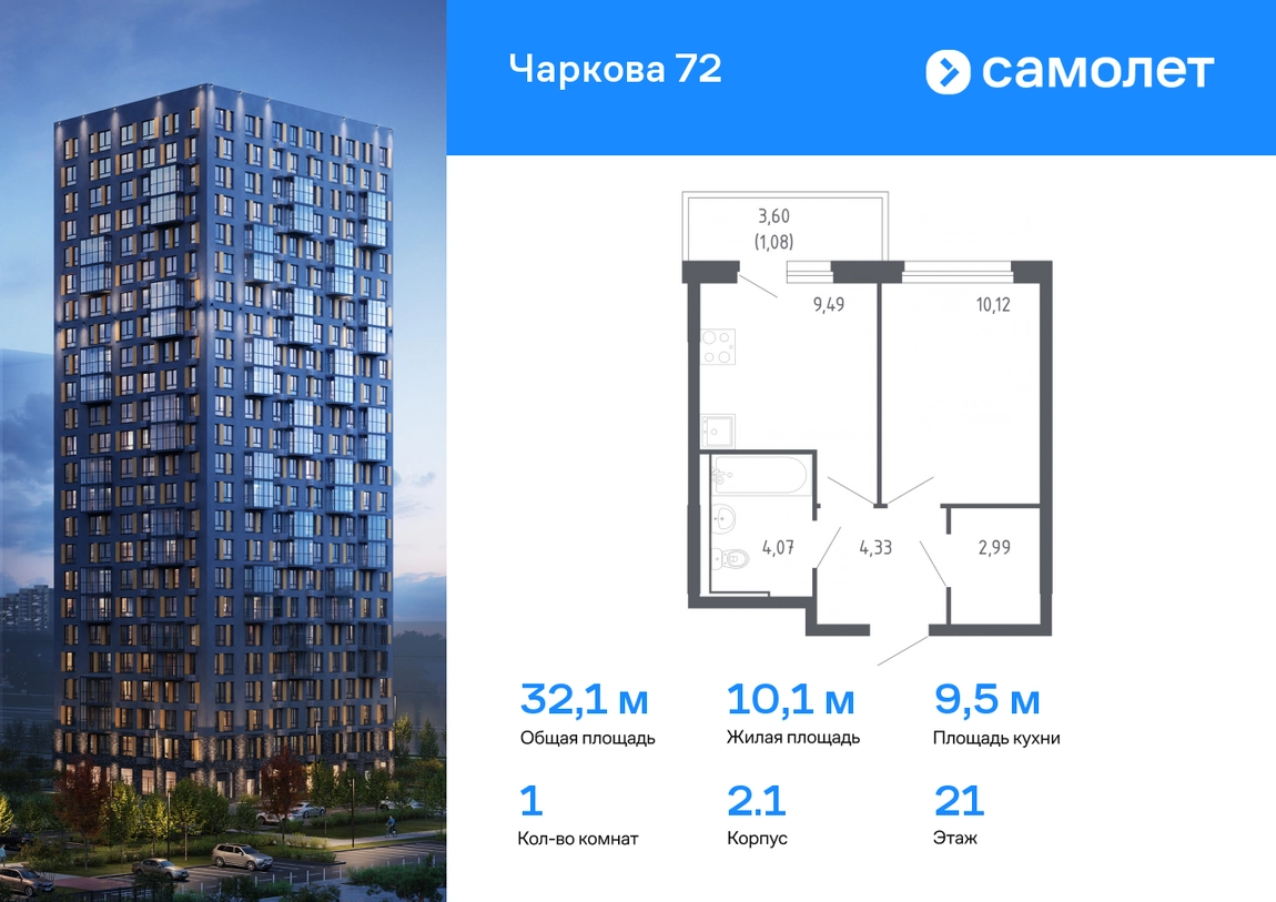 Строим кварталы для жизни с заботой о будущем. Предлагается 1-комнатная квартира комфорт-класса 32,08 кв.м в корпусе 2.1 на 21 этаже, в ЖК «Чаркова 72» Квартира с чистовой отделкой. Доступность дополнительных опций уточняйте у застройщика. Приобрести квартиру возможно по специальным акциям от застройщика, с текущими условиями акций можно ознакомиться в блоке «Акций». Цена динамическая и может отличаться, уточняйте актуальность у застройщика. Идеальное сочетание городского комфорта и размеренной жизни — квартал «Чаркова 72» на северо-востоке города. В дизайне 17-24-этажных домов с панорамными балконами нашли отражение нотки сибирской природы. От «Чаркова 72» удобно добираться до центра города — всего 17 минут пути. А в 2 минутах от дома находится Тобольский тракт. Для семейного отдыха отлично подойдет парк Гагарина — он находится в 7 минутах от квартала. В закрытых дворах тихо и уютно — все авто остались на одном из 4 многоуровневых паркингов, которые находятся за территорией квартала. Можно спокойно гулять по бульвару и заниматься йогой на спортивной площадке. На первых этажах домов — кафе и магазины. Рядом с проектом — детские сады и школы, городская поликлиника и МФЦ. Во всех квартирах есть выводы под кондиционеры, на подземных этажах — индивидуальные кладовые, на первых — места для хранения велосипедов и колясок. В квартирах можно выбрать варианты отделки: чистовая, черновая и улучшенная из материалов повышенного класса.#yan19-2r1679195#О застройщике