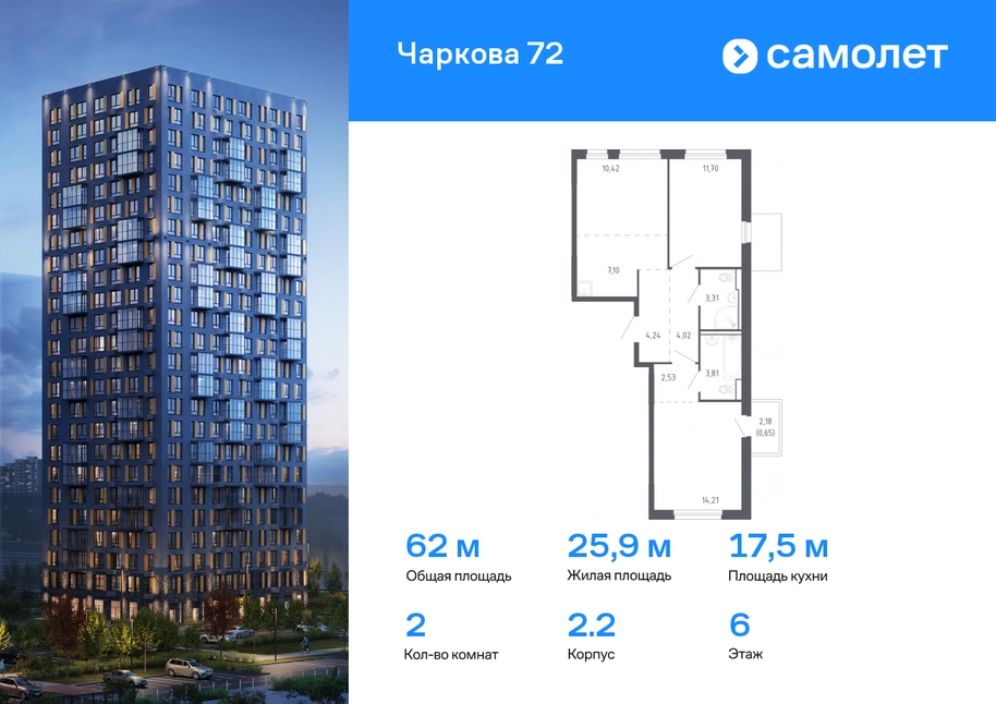 Предлагается 2-комнатная квартира комфорт-класса 61,99 кв.м в корпусе 2.2 на 6 этаже, в ЖК «Чаркова 72» Квартира с предчистовой отделкой. Доступность дополнительных опций уточняйте у застройщика. Планировкой предусмотрены: Прихожая - 4,24 м² Коридор - 4,02 м² Кухня-ниша - 7,1 м² Жилая_комната_1 - 10,42 м² Жилая_комната_2 - 11,7 м² Жилая_комната_3 - 14,21 м² СУ_1 - 3,31 м² СУ_2 - 3,81 м² Гардеробная_1 - 2,53 м² Балкон - 0,65 м² Приобрести квартиру возможно по специальным акциям от застройщика, с текущими условиями акций можно ознакомиться в блоке “Акций”. Цена динамическая и может отличаться, уточняйте актуальность у застройщика. Идеальное сочетание городского комфорта и размеренной жизни — квартал «Чаркова 72» на северо-востоке города. В дизайне 17-24-этажных домов с панорамными балконами нашли отражение нотки сибирской природы. От «Чаркова 72» удобно добираться до центра города — всего 17 минут пути. А в 2 минутах от дома находится Тобольский тракт. Для семейного отдыха отлично подойдет парк Гагарина — он находится в 7 минутах от квартала. В закрытых дворах тихо и уютно — все авто остались на одном из 4 многоуровневых паркингов, которые находятся за территорией квартала. Можно спокойно гулять по бульвару и заниматься йогой на спортивной площадке. На первых этажах домов — кафе и магазины. Рядом с проектом — детские сады и школы, городская поликлиника и МФЦ. Во всех квартирах есть выводы под кондиционеры, на подземных этажах — индивидуальные кладовые, на первых — места для хранения велосипедов и колясок. В квартирах можно выбрать варианты отделки: чистовая, черновая и улучшенная из материалов повышенного класса.#yan19-2r1691890#О застройщике