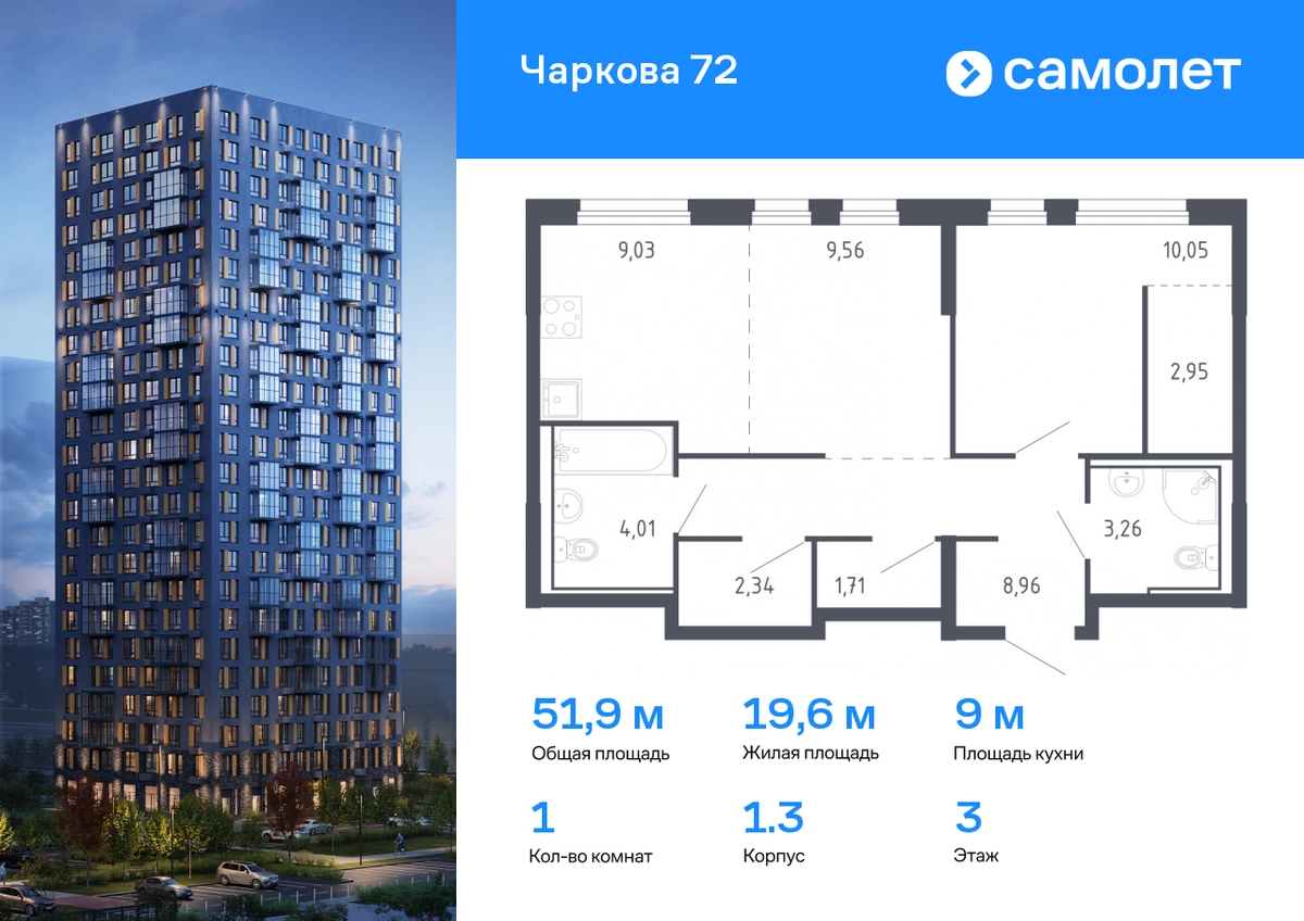 Строим кварталы для жизни с заботой о будущем. Предлагается 1-комнатная квартира комфорт-класса 51,87 кв.м в корпусе 1.3 на 3 этаже, в ЖК «Чаркова 72» Квартира с предчистовой отделкой. Доступность дополнительных опций уточняйте у застройщика. Приобрести квартиру возможно по специальным акциям от застройщика, с текущими условиями акций можно ознакомиться в блоке «Акций». Цена динамическая и может отличаться, уточняйте актуальность у застройщика. Идеальное сочетание городского комфорта и размеренной жизни — квартал «Чаркова 72» на северо-востоке города. В дизайне 17-24-этажных домов с панорамными балконами нашли отражение нотки сибирской природы. От «Чаркова 72» удобно добираться до центра города — всего 17 минут пути. А в 2 минутах от дома находится Тобольский тракт. Для семейного отдыха отлично подойдет парк Гагарина — он находится в 7 минутах от квартала. В закрытых дворах тихо и уютно — все авто остались на одном из 4 многоуровневых паркингов, которые находятся за территорией квартала. Можно спокойно гулять по бульвару и заниматься йогой на спортивной площадке. На первых этажах домов — кафе и магазины. Рядом с проектом — детские сады и школы, городская поликлиника и МФЦ. Во всех квартирах есть выводы под кондиционеры, на подземных этажах — индивидуальные кладовые, на первых — места для хранения велосипедов и колясок. В квартирах можно выбрать варианты отделки: чистовая, черновая и улучшенная из материалов повышенного класса.#yan19-2r1694053#О застройщике