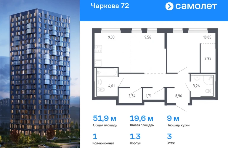 Строим кварталы для жизни с заботой о будущем. Предлагается 1-комнатная квартира комфорт-класса 51,87 кв.м в корпусе 1.3 на 3 этаже, в ЖК «Чаркова 72» Квартира с предчистовой отделкой. Доступность дополнительных опций уточняйте у застройщика. Приобрести квартиру возможно по специальным акциям от застройщика, с текущими условиями акций можно ознакомиться в блоке «Акций». Цена динамическая и может отличаться, уточняйте актуальность у застройщика. Идеальное сочетание городского комфорта и размеренной жизни — квартал «Чаркова 72» на северо-востоке города. В дизайне 17-24-этажных домов с панорамными балконами нашли отражение нотки сибирской природы. От «Чаркова 72» удобно добираться до центра города — всего 17 минут пути. А в 2 минутах от дома находится Тобольский тракт. Для семейного отдыха отлично подойдет парк Гагарина — он находится в 7 минутах от квартала. В закрытых дворах тихо и уютно — все авто остались на одном из 4 многоуровневых паркингов, которые находятся за территорией квартала. Можно спокойно гулять по бульвару и заниматься йогой на спортивной площадке. На первых этажах домов — кафе и магазины. Рядом с проектом — детские сады и школы, городская поликлиника и МФЦ. Во всех квартирах есть выводы под кондиционеры, на подземных этажах — индивидуальные кладовые, на первых — места для хранения велосипедов и колясок. В квартирах можно выбрать варианты отделки: чистовая, черновая и улучшенная из материалов повышенного класса.#yan19-2r1694053#О застройщике