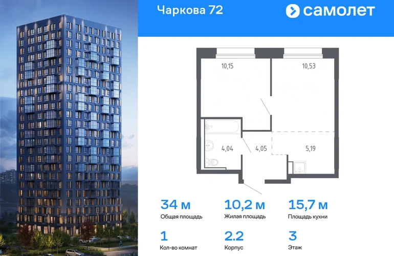 Строим кварталы для жизни с заботой о будущем. Предлагается 1-комнатная квартира комфорт-класса 33,96 кв.м в корпусе 2.2 на 3 этаже, в ЖК «Чаркова 72» Квартира с предчистовой отделкой. Доступность дополнительных опций уточняйте у застройщика. Приобрести квартиру возможно по специальным акциям от застройщика, с текущими условиями акций можно ознакомиться в блоке «Акций». Цена динамическая и может отличаться, уточняйте актуальность у застройщика. Идеальное сочетание городского комфорта и размеренной жизни — квартал «Чаркова 72» на северо-востоке города. В дизайне 17-24-этажных домов с панорамными балконами нашли отражение нотки сибирской природы. От «Чаркова 72» удобно добираться до центра города — всего 17 минут пути. А в 2 минутах от дома находится Тобольский тракт. Для семейного отдыха отлично подойдет парк Гагарина — он находится в 7 минутах от квартала. В закрытых дворах тихо и уютно — все авто остались на одном из 4 многоуровневых паркингов, которые находятся за территорией квартала. Можно спокойно гулять по бульвару и заниматься йогой на спортивной площадке. На первых этажах домов — кафе и магазины. Рядом с проектом — детские сады и школы, городская поликлиника и МФЦ. Во всех квартирах есть выводы под кондиционеры, на подземных этажах — индивидуальные кладовые, на первых — места для хранения велосипедов и колясок. В квартирах можно выбрать варианты отделки: чистовая, черновая и улучшенная из материалов повышенного класса.#yan19-2r1694060#О застройщике