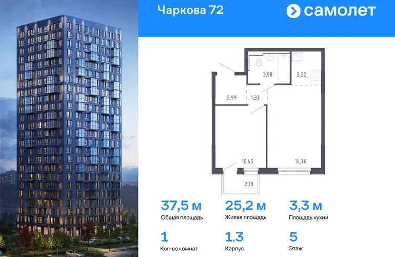 Предлагается 1-комнатная квартира комфорт-класса 37,48 кв.м в корпусе 1.3 на 5 этаже, в ЖК «Чаркова 72» Квартира с предчистовой отделкой. Доступность дополнительных опций уточняйте у застройщика. Приобрести квартиру возможно по специальным акциям от застройщика, с текущими условиями акций можно ознакомиться в блоке «Акций». Цена динамическая и может отличаться, уточняйте актуальность у застройщика. Идеальное сочетание городского комфорта и размеренной жизни — квартал «Чаркова 72» на северо-востоке города. В дизайне 17-24-этажных домов с панорамными балконами нашли отражение нотки сибирской природы. От «Чаркова 72» удобно добираться до центра города — всего 17 минут пути. А в 2 минутах от дома находится Тобольский тракт. Для семейного отдыха отлично подойдет парк Гагарина — он находится в 7 минутах от квартала. В закрытых дворах тихо и уютно — все авто остались на одном из 4 многоуровневых паркингов, которые находятся за территорией квартала. Можно спокойно гулять по бульвару и заниматься йогой на спортивной площадке. На первых этажах домов — кафе и магазины. Рядом с проектом — детские сады и школы, городская поликлиника и МФЦ. Во всех квартирах есть выводы под кондиционеры, на подземных этажах — индивидуальные кладовые, на первых — места для хранения велосипедов и колясок. В квартирах можно выбрать варианты отделки: чистовая, черновая и улучшенная из материалов повышенного класса.#yan19-2r1714730#О застройщике