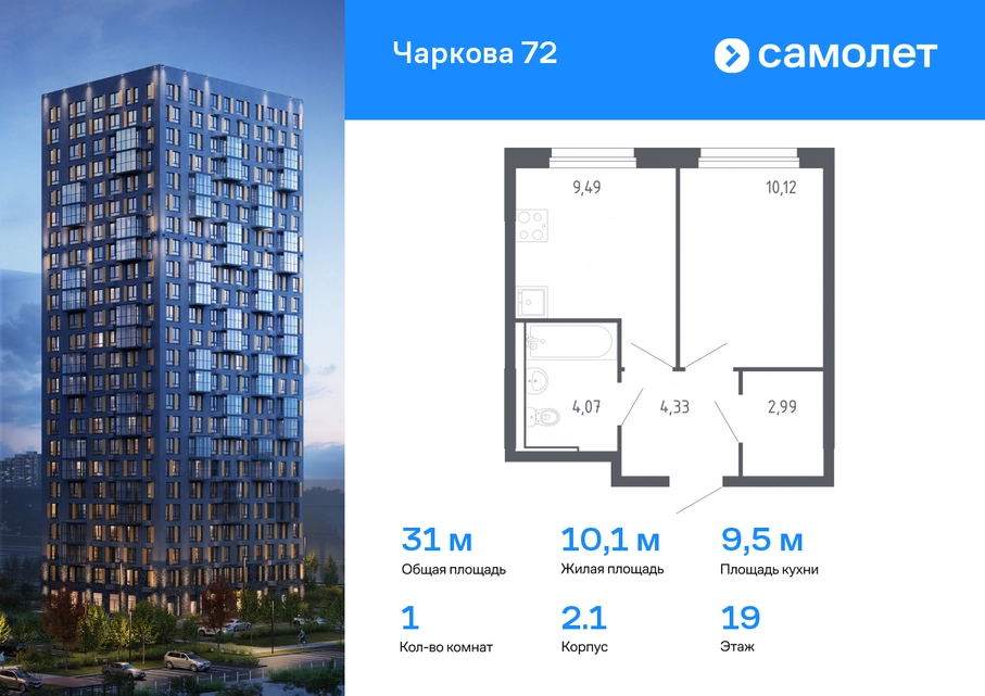 Строим кварталы для жизни с заботой о будущем. Предлагается 1-комнатная квартира комфорт-класса 31 кв.м в корпусе 2.1 на 19 этаже, в ЖК «Чаркова 72» Квартира с чистовой отделкой. Доступность дополнительных опций уточняйте у застройщика. Приобрести квартиру возможно по специальным акциям от застройщика, с текущими условиями акций можно ознакомиться в блоке «Акций». Цена динамическая и может отличаться, уточняйте актуальность у застройщика. Идеальное сочетание городского комфорта и размеренной жизни — квартал «Чаркова 72» на северо-востоке города. В дизайне 17-24-этажных домов с панорамными балконами нашли отражение нотки сибирской природы. От «Чаркова 72» удобно добираться до центра города — всего 17 минут пути. А в 2 минутах от дома находится Тобольский тракт. Для семейного отдыха отлично подойдет парк Гагарина — он находится в 7 минутах от квартала. В закрытых дворах тихо и уютно — все авто остались на одном из 4 многоуровневых паркингов, которые находятся за территорией квартала. Можно спокойно гулять по бульвару и заниматься йогой на спортивной площадке. На первых этажах домов — кафе и магазины. Рядом с проектом — детские сады и школы, городская поликлиника и МФЦ. Во всех квартирах есть выводы под кондиционеры, на подземных этажах — индивидуальные кладовые, на первых — места для хранения велосипедов и колясок. В квартирах можно выбрать варианты отделки: чистовая, черновая и улучшенная из материалов повышенного класса.#yan19-2r1744967#О застройщике