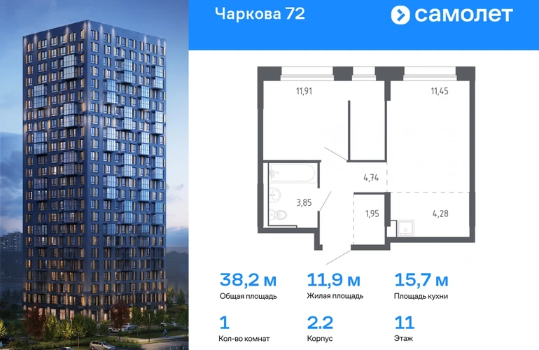 Предлагается 1-комнатная квартира комфорт-класса 38,18 кв.м в корпусе 2.2 на 11 этаже, в ЖК «Чаркова 72» Квартира с чистовой отделкой. Доступность дополнительных опций уточняйте у застройщика. Приобрести квартиру возможно по специальным акциям от застройщика, с текущими условиями акций можно ознакомиться в блоке «Акций». Цена динамическая и может отличаться, уточняйте актуальность у застройщика. Идеальное сочетание городского комфорта и размеренной жизни — квартал «Чаркова 72» на северо-востоке города. В дизайне 17-24-этажных домов с панорамными балконами нашли отражение нотки сибирской природы. От «Чаркова 72» удобно добираться до центра города — всего 17 минут пути. А в 2 минутах от дома находится Тобольский тракт. Для семейного отдыха отлично подойдет парк Гагарина — он находится в 7 минутах от квартала. В закрытых дворах тихо и уютно — все авто остались на одном из 4 многоуровневых паркингов, которые находятся за территорией квартала. Можно спокойно гулять по бульвару и заниматься йогой на спортивной площадке. На первых этажах домов — кафе и магазины. Рядом с проектом — детские сады и школы, городская поликлиника и МФЦ. Во всех квартирах есть выводы под кондиционеры, на подземных этажах — индивидуальные кладовые, на первых — места для хранения велосипедов и колясок. В квартирах можно выбрать варианты отделки: чистовая, черновая и улучшенная из материалов повышенного класса.#yan19-2r1745002#О застройщике