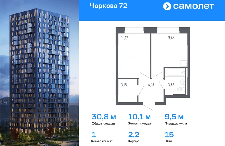 Предлагается 1-комнатная квартира комфорт-класса 30,79 кв.м в корпусе 2.2 на 15 этаже, в ЖК «Чаркова 72» Квартира с чистовой отделкой. Доступность дополнительных опций уточняйте у застройщика. Приобрести квартиру возможно по специальным акциям от застройщика, с текущими условиями акций можно ознакомиться в блоке “Акций”. Цена динамическая и может отличаться, уточняйте актуальность у застройщика. Идеальное сочетание городского комфорта и размеренной жизни — квартал «Чаркова 72» на северо-востоке города. В дизайне 17-24-этажных домов с панорамными балконами нашли отражение нотки сибирской природы. От «Чаркова 72» удобно добираться до центра города — всего 17 минут пути. А в 2 минутах от дома находится Тобольский тракт. Для семейного отдыха отлично подойдет парк Гагарина — он находится в 7 минутах от квартала. В закрытых дворах тихо и уютно — все авто остались на одном из 4 многоуровневых паркингов, которые находятся за территорией квартала. Можно спокойно гулять по бульвару и заниматься йогой на спортивной площадке. На первых этажах домов — кафе и магазины. Рядом с проектом — детские сады и школы, городская поликлиника и МФЦ. Во всех квартирах есть выводы под кондиционеры, на подземных этажах — индивидуальные кладовые, на первых — места для хранения велосипедов и колясок. В квартирах можно выбрать варианты отделки: чистовая, черновая и улучшенная из материалов повышенного класса.#yan19-2r1745006#О застройщике