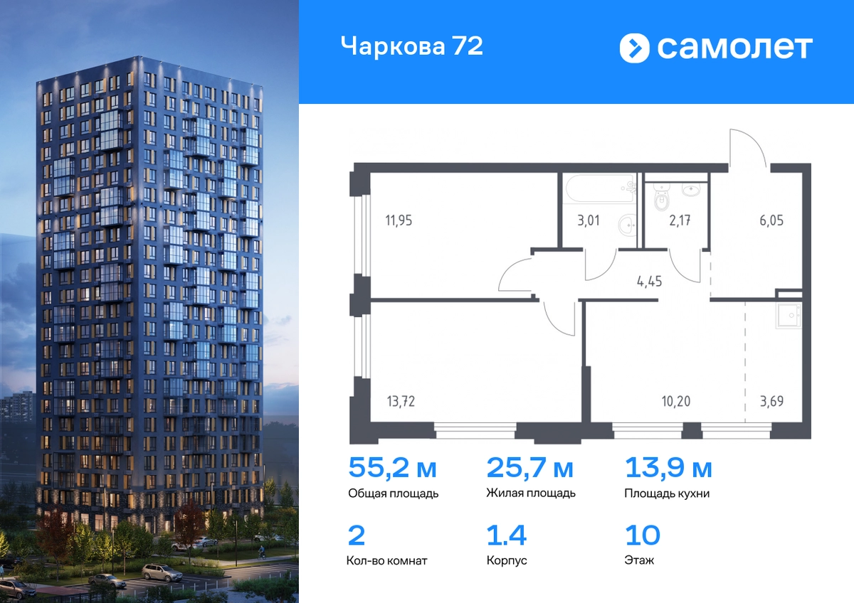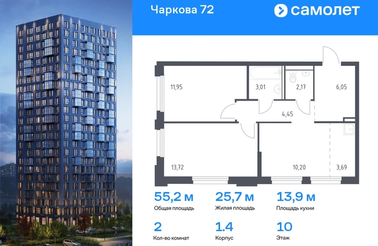 Предлагается 2-комнатная квартира комфорт-класса 55,24 кв.м в корпусе 1.4 на 10 этаже, в ЖК «Чаркова 72» Квартира с чистовой отделкой. Доступность дополнительных опций уточняйте у застройщика. Приобрести квартиру возможно по специальным акциям от застройщика, с текущими условиями акций можно ознакомиться в блоке “Акций”. Цена динамическая и может отличаться, уточняйте актуальность у застройщика. Идеальное сочетание городского комфорта и размеренной жизни — квартал «Чаркова 72» на северо-востоке города. В дизайне 17-24-этажных домов с панорамными балконами нашли отражение нотки сибирской природы. От «Чаркова 72» удобно добираться до центра города — всего 17 минут пути. А в 2 минутах от дома находится Тобольский тракт. Для семейного отдыха отлично подойдет парк Гагарина — он находится в 7 минутах от квартала. В закрытых дворах тихо и уютно — все авто остались на одном из 4 многоуровневых паркингов, которые находятся за территорией квартала. Можно спокойно гулять по бульвару и заниматься йогой на спортивной площадке. На первых этажах домов — кафе и магазины. Рядом с проектом — детские сады и школы, городская поликлиника и МФЦ. Во всех квартирах есть выводы под кондиционеры, на подземных этажах — индивидуальные кладовые, на первых — места для хранения велосипедов и колясок. В квартирах можно выбрать варианты отделки: чистовая, черновая и улучшенная из материалов повышенного класса.#yan19-2r1747321#О застройщике