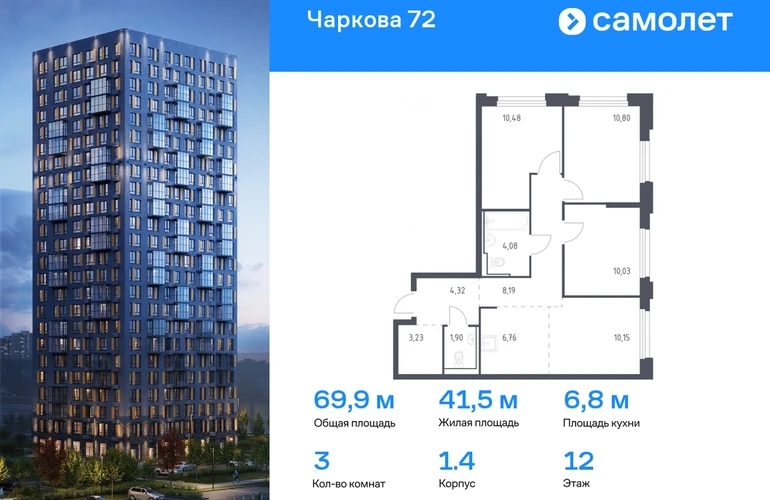 Предлагается 3-комнатная квартира комфорт-класса 69,94 кв.м в корпусе 1.4 на 12 этаже, в ЖК «Чаркова 72» Квартира с чистовой отделкой. Доступность дополнительных опций уточняйте у застройщика. Приобрести квартиру возможно по специальным акциям от застройщика, с текущими условиями акций можно ознакомиться в блоке “Акций”. Цена динамическая и может отличаться, уточняйте актуальность у застройщика. Идеальное сочетание городского комфорта и размеренной жизни — квартал «Чаркова 72» на северо-востоке города. В дизайне 17-24-этажных домов с панорамными балконами нашли отражение нотки сибирской природы. От «Чаркова 72» удобно добираться до центра города — всего 17 минут пути. А в 2 минутах от дома находится Тобольский тракт. Для семейного отдыха отлично подойдет парк Гагарина — он находится в 7 минутах от квартала. В закрытых дворах тихо и уютно — все авто остались на одном из 4 многоуровневых паркингов, которые находятся за территорией квартала. Можно спокойно гулять по бульвару и заниматься йогой на спортивной площадке. На первых этажах домов — кафе и магазины. Рядом с проектом — детские сады и школы, городская поликлиника и МФЦ. Во всех квартирах есть выводы под кондиционеры, на подземных этажах — индивидуальные кладовые, на первых — места для хранения велосипедов и колясок. В квартирах можно выбрать варианты отделки: чистовая, черновая и улучшенная из материалов повышенного класса.#yan19-2r1747325#О застройщике
