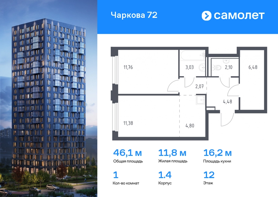 Строим кварталы для жизни с заботой о будущем. Предлагается 1-комнатная квартира комфорт-класса 46,1 кв.м в корпусе 1.4 на 12 этаже, в ЖК «Чаркова 72» Квартира с чистовой отделкой. Доступность дополнительных опций уточняйте у застройщика. Приобрести квартиру возможно по специальным акциям от застройщика, с текущими условиями акций можно ознакомиться в блоке «Акций». Цена динамическая и может отличаться, уточняйте актуальность у застройщика. Идеальное сочетание городского комфорта и размеренной жизни — квартал «Чаркова 72» на северо-востоке города. В дизайне 17-24-этажных домов с панорамными балконами нашли отражение нотки сибирской природы. От «Чаркова 72» удобно добираться до центра города — всего 17 минут пути. А в 2 минутах от дома находится Тобольский тракт. Для семейного отдыха отлично подойдет парк Гагарина — он находится в 7 минутах от квартала. В закрытых дворах тихо и уютно — все авто остались на одном из 4 многоуровневых паркингов, которые находятся за территорией квартала. Можно спокойно гулять по бульвару и заниматься йогой на спортивной площадке. На первых этажах домов — кафе и магазины. Рядом с проектом — детские сады и школы, городская поликлиника и МФЦ. Во всех квартирах есть выводы под кондиционеры, на подземных этажах — индивидуальные кладовые, на первых — места для хранения велосипедов и колясок. В квартирах можно выбрать варианты отделки: чистовая, черновая и улучшенная из материалов повышенного класса.#yan19-2r1747328#О застройщике