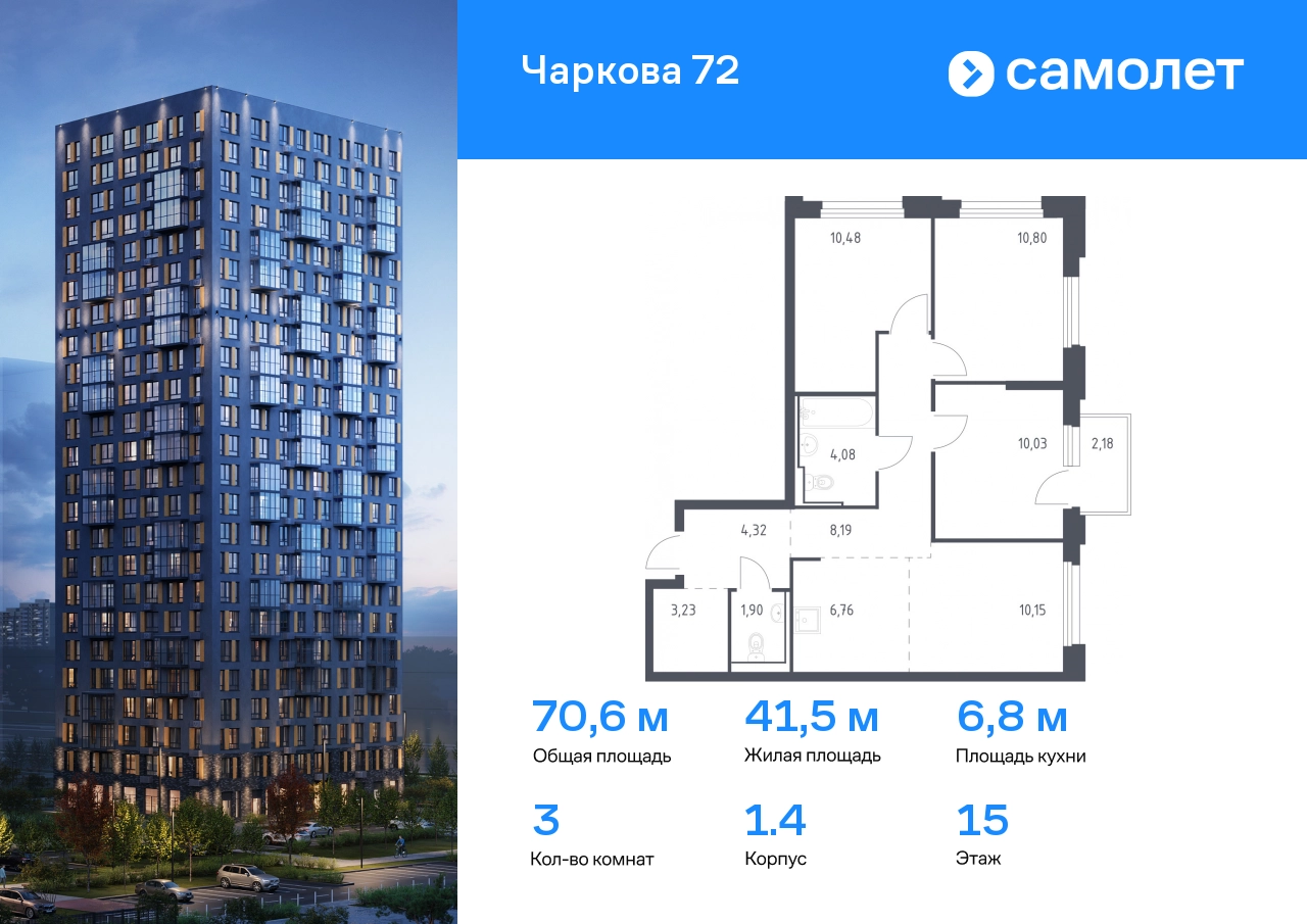 Предлагается 3-комнатная квартира комфорт-класса 70,59 кв.м в корпусе 1.4 на 15 этаже, в ЖК «Чаркова 72» Квартира с чистовой отделкой. Доступность дополнительных опций уточняйте у застройщика. Приобрести квартиру возможно по специальным акциям от застройщика, с текущими условиями акций можно ознакомиться в блоке “Акций”. Цена динамическая и может отличаться, уточняйте актуальность у застройщика. Идеальное сочетание городского комфорта и размеренной жизни — квартал «Чаркова 72» на северо-востоке города. В дизайне 17-24-этажных домов с панорамными балконами нашли отражение нотки сибирской природы. От «Чаркова 72» удобно добираться до центра города — всего 17 минут пути. А в 2 минутах от дома находится Тобольский тракт. Для семейного отдыха отлично подойдет парк Гагарина — он находится в 7 минутах от квартала. В закрытых дворах тихо и уютно — все авто остались на одном из 4 многоуровневых паркингов, которые находятся за территорией квартала. Можно спокойно гулять по бульвару и заниматься йогой на спортивной площадке. На первых этажах домов — кафе и магазины. Рядом с проектом — детские сады и школы, городская поликлиника и МФЦ. Во всех квартирах есть выводы под кондиционеры, на подземных этажах — индивидуальные кладовые, на первых — места для хранения велосипедов и колясок. В квартирах можно выбрать варианты отделки: чистовая, черновая и улучшенная из материалов повышенного класса.#yan19-2r1747331#О застройщике