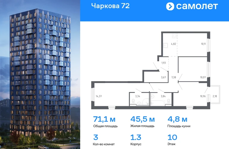 Предлагается 3-комнатная квартира комфорт-класса 71,14 кв.м в корпусе 1.3 на 10 этаже, в ЖК «Чаркова 72» Квартира с предчистовой отделкой. Доступность дополнительных опций уточняйте у застройщика. Приобрести квартиру возможно по специальным акциям от застройщика, с текущими условиями акций можно ознакомиться в блоке “Акций”. Цена динамическая и может отличаться, уточняйте актуальность у застройщика. Идеальное сочетание городского комфорта и размеренной жизни — квартал «Чаркова 72» на северо-востоке города. В дизайне 17-24-этажных домов с панорамными балконами нашли отражение нотки сибирской природы. От «Чаркова 72» удобно добираться до центра города — всего 17 минут пути. А в 2 минутах от дома находится Тобольский тракт. Для семейного отдыха отлично подойдет парк Гагарина — он находится в 7 минутах от квартала. В закрытых дворах тихо и уютно — все авто остались на одном из 4 многоуровневых паркингов, которые находятся за территорией квартала. Можно спокойно гулять по бульвару и заниматься йогой на спортивной площадке. На первых этажах домов — кафе и магазины. Рядом с проектом — детские сады и школы, городская поликлиника и МФЦ. Во всех квартирах есть выводы под кондиционеры, на подземных этажах — индивидуальные кладовые, на первых — места для хранения велосипедов и колясок. В квартирах можно выбрать варианты отделки: чистовая, черновая и улучшенная из материалов повышенного класса.#yan19-2r1747346#О застройщике