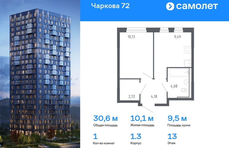Строим кварталы для жизни с заботой о будущем. Предлагается 1-комнатная квартира комфорт-класса 30,6 кв.м в корпусе 1.3 на 13 этаже, в ЖК «Чаркова 72» Квартира с предчистовой отделкой. Доступность дополнительных опций уточняйте у застройщика. Приобрести квартиру возможно по специальным акциям от застройщика, с текущими условиями акций можно ознакомиться в блоке «Акций». Цена динамическая и может отличаться, уточняйте актуальность у застройщика. Идеальное сочетание городского комфорта и размеренной жизни — квартал «Чаркова 72» на северо-востоке города. В дизайне 17-24-этажных домов с панорамными балконами нашли отражение нотки сибирской природы. От «Чаркова 72» удобно добираться до центра города — всего 17 минут пути. А в 2 минутах от дома находится Тобольский тракт. Для семейного отдыха отлично подойдет парк Гагарина — он находится в 7 минутах от квартала. В закрытых дворах тихо и уютно — все авто остались на одном из 4 многоуровневых паркингов, которые находятся за территорией квартала. Можно спокойно гулять по бульвару и заниматься йогой на спортивной площадке. На первых этажах домов — кафе и магазины. Рядом с проектом — детские сады и школы, городская поликлиника и МФЦ. Во всех квартирах есть выводы под кондиционеры, на подземных этажах — индивидуальные кладовые, на первых — места для хранения велосипедов и колясок. В квартирах можно выбрать варианты отделки: чистовая, черновая и улучшенная из материалов повышенного класса.#yan19-2r1747347#О застройщике