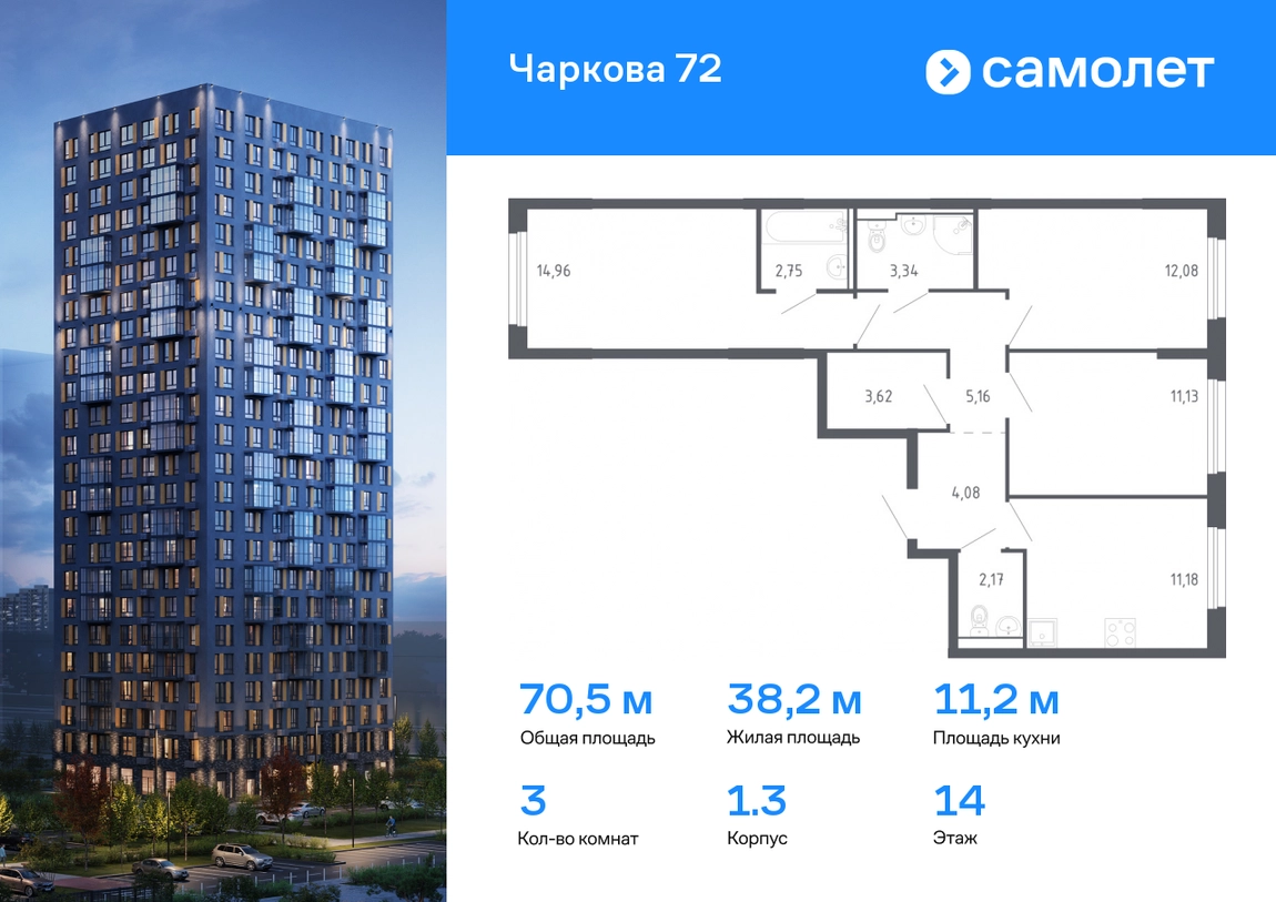 Строим кварталы для жизни с заботой о будущем. Предлагается 3-комнатная квартира комфорт-класса 70,47 кв.м в корпусе 1.3 на 14 этаже, в ЖК «Чаркова 72» Квартира с предчистовой отделкой. Доступность дополнительных опций уточняйте у застройщика. Приобрести квартиру возможно по специальным акциям от застройщика, с текущими условиями акций можно ознакомиться в блоке «Акций». Цена динамическая и может отличаться, уточняйте актуальность у застройщика. Идеальное сочетание городского комфорта и размеренной жизни — квартал «Чаркова 72» на северо-востоке города. В дизайне 17-24-этажных домов с панорамными балконами нашли отражение нотки сибирской природы. От «Чаркова 72» удобно добираться до центра города — всего 17 минут пути. А в 2 минутах от дома находится Тобольский тракт. Для семейного отдыха отлично подойдет парк Гагарина — он находится в 7 минутах от квартала. В закрытых дворах тихо и уютно — все авто остались на одном из 4 многоуровневых паркингов, которые находятся за территорией квартала. Можно спокойно гулять по бульвару и заниматься йогой на спортивной площадке. На первых этажах домов — кафе и магазины. Рядом с проектом — детские сады и школы, городская поликлиника и МФЦ. Во всех квартирах есть выводы под кондиционеры, на подземных этажах — индивидуальные кладовые, на первых — места для хранения велосипедов и колясок. В квартирах можно выбрать варианты отделки: чистовая, черновая и улучшенная из материалов повышенного класса.#yan19-2r1747352#О застройщике
