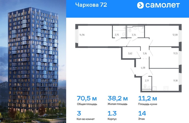 Строим кварталы для жизни с заботой о будущем. Предлагается 3-комнатная квартира комфорт-класса 70,47 кв.м в корпусе 1.3 на 14 этаже, в ЖК «Чаркова 72» Квартира с предчистовой отделкой. Доступность дополнительных опций уточняйте у застройщика. Приобрести квартиру возможно по специальным акциям от застройщика, с текущими условиями акций можно ознакомиться в блоке «Акций». Цена динамическая и может отличаться, уточняйте актуальность у застройщика. Идеальное сочетание городского комфорта и размеренной жизни — квартал «Чаркова 72» на северо-востоке города. В дизайне 17-24-этажных домов с панорамными балконами нашли отражение нотки сибирской природы. От «Чаркова 72» удобно добираться до центра города — всего 17 минут пути. А в 2 минутах от дома находится Тобольский тракт. Для семейного отдыха отлично подойдет парк Гагарина — он находится в 7 минутах от квартала. В закрытых дворах тихо и уютно — все авто остались на одном из 4 многоуровневых паркингов, которые находятся за территорией квартала. Можно спокойно гулять по бульвару и заниматься йогой на спортивной площадке. На первых этажах домов — кафе и магазины. Рядом с проектом — детские сады и школы, городская поликлиника и МФЦ. Во всех квартирах есть выводы под кондиционеры, на подземных этажах — индивидуальные кладовые, на первых — места для хранения велосипедов и колясок. В квартирах можно выбрать варианты отделки: чистовая, черновая и улучшенная из материалов повышенного класса.#yan19-2r1747352#О застройщике