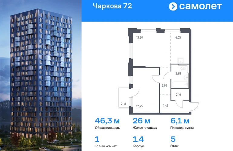 Строим кварталы для жизни с заботой о будущем. Предлагается 1-комнатная квартира комфорт-класса 46,31 кв.м в корпусе 1.4 на 5 этаже, в ЖК «Чаркова 72» Квартира с чистовой отделкой. Доступность дополнительных опций уточняйте у застройщика. Приобрести квартиру возможно по специальным акциям от застройщика, с текущими условиями акций можно ознакомиться в блоке «Акций». Цена динамическая и может отличаться, уточняйте актуальность у застройщика. Идеальное сочетание городского комфорта и размеренной жизни — квартал «Чаркова 72» на северо-востоке города. В дизайне 17-24-этажных домов с панорамными балконами нашли отражение нотки сибирской природы. От «Чаркова 72» удобно добираться до центра города — всего 17 минут пути. А в 2 минутах от дома находится Тобольский тракт. Для семейного отдыха отлично подойдет парк Гагарина — он находится в 7 минутах от квартала. В закрытых дворах тихо и уютно — все авто остались на одном из 4 многоуровневых паркингов, которые находятся за территорией квартала. Можно спокойно гулять по бульвару и заниматься йогой на спортивной площадке. На первых этажах домов — кафе и магазины. Рядом с проектом — детские сады и школы, городская поликлиника и МФЦ. Во всех квартирах есть выводы под кондиционеры, на подземных этажах — индивидуальные кладовые, на первых — места для хранения велосипедов и колясок. В квартирах можно выбрать варианты отделки: чистовая, черновая и улучшенная из материалов повышенного класса.#yan19-2r1765250#О застройщике