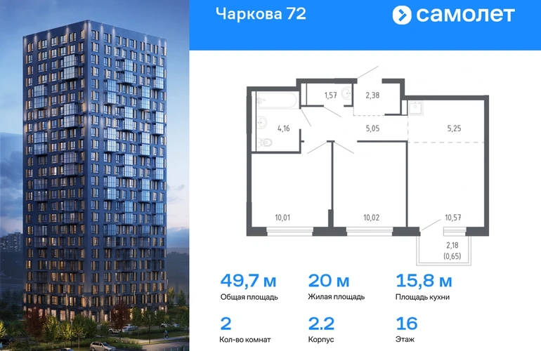 Предлагается 2-комнатная квартира комфорт-класса 49,66 кв.м в корпусе 2.2 на 16 этаже, в ЖК «Чаркова 72» Квартира с предчистовой отделкой. Доступность дополнительных опций уточняйте у застройщика. Планировкой предусмотрены: Прихожая - 2,38 м² Коридор - 5,05 м² Кухня-ниша - 5,25 м² Жилая_комната_1 - 10,57 м² Жилая_комната_2 - 10,02 м² Жилая_комната_3 - 10,01 м² СУ_1 - 4,16 м² Постирочная - 1,57 м² Балкон - 0,65 м² Приобрести квартиру возможно по специальным акциям от застройщика, с текущими условиями акций можно ознакомиться в блоке “Акций”. Цена динамическая и может отличаться, уточняйте актуальность у застройщика. Идеальное сочетание городского комфорта и размеренной жизни — квартал «Чаркова 72» на северо-востоке города. В дизайне 17-24-этажных домов с панорамными балконами нашли отражение нотки сибирской природы. От «Чаркова 72» удобно добираться до центра города — всего 17 минут пути. А в 2 минутах от дома находится Тобольский тракт. Для семейного отдыха отлично подойдет парк Гагарина — он находится в 7 минутах от квартала. В закрытых дворах тихо и уютно — все авто остались на одном из 4 многоуровневых паркингов, которые находятся за территорией квартала. Можно спокойно гулять по бульвару и заниматься йогой на спортивной площадке. На первых этажах домов — кафе и магазины. Рядом с проектом — детские сады и школы, городская поликлиника и МФЦ. Во всех квартирах есть выводы под кондиционеры, на подземных этажах — индивидуальные кладовые, на первых — места для хранения велосипедов и колясок. В квартирах можно выбрать варианты отделки: чистовая, черновая и улучшенная из материалов повышенного класса.#yan19-2r1766005#О застройщике