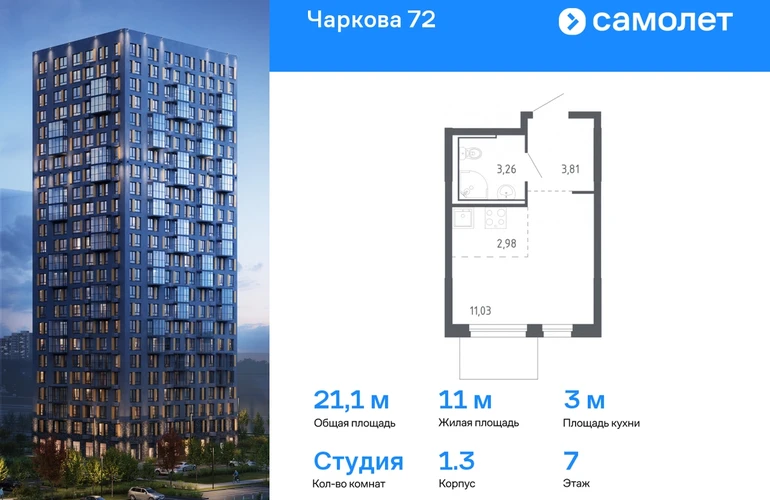 Предлагается квартира студия комфорт-класса 21,08 кв.м в корпусе 1.3 на 7 этаже, в ЖК «Чаркова 72» Квартира с предчистовой отделкой. Доступность дополнительных опций уточняйте у застройщика. Планировкой предусмотрены: Прихожая - 3,81 м² Кухня-ниша - 2,98 м² Студия - 11,03 м² СУ_1 - 3,26 м² Приобрести квартиру возможно по специальным акциям от застройщика, с текущими условиями акций можно ознакомиться в блоке “Акций”. Цена динамическая и может отличаться, уточняйте актуальность у застройщика. Идеальное сочетание городского комфорта и размеренной жизни — квартал «Чаркова 72» на северо-востоке города. В дизайне 17-24-этажных домов с панорамными балконами нашли отражение нотки сибирской природы. От «Чаркова 72» удобно добираться до центра города — всего 17 минут пути. А в 2 минутах от дома находится Тобольский тракт. Для семейного отдыха отлично подойдет парк Гагарина — он находится в 7 минутах от квартала. В закрытых дворах тихо и уютно — все авто остались на одном из 4 многоуровневых паркингов, которые находятся за территорией квартала. Можно спокойно гулять по бульвару и заниматься йогой на спортивной площадке. На первых этажах домов — кафе и магазины. Рядом с проектом — детские сады и школы, городская поликлиника и МФЦ. Во всех квартирах есть выводы под кондиционеры, на подземных этажах — индивидуальные кладовые, на первых — места для хранения велосипедов и колясок. В квартирах можно выбрать варианты отделки: чистовая, черновая и улучшенная из материалов повышенного класса.#yan19-2r1766590#О застройщике