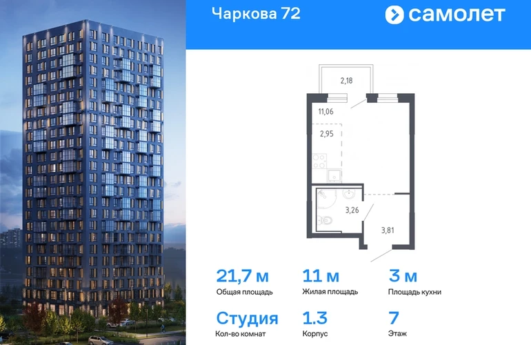 Предлагается квартира студия комфорт-класса 21,73 кв.м в корпусе 1.3 на 7 этаже, в ЖК «Чаркова 72» Квартира с предчистовой отделкой. Доступность дополнительных опций уточняйте у застройщика. Планировкой предусмотрены: Прихожая - 3,81 м² Кухня-ниша - 2,95 м² Студия - 11,06 м² СУ_1 - 3,26 м² Балкон - 0,65 м² Приобрести квартиру возможно по специальным акциям от застройщика, с текущими условиями акций можно ознакомиться в блоке “Акций”. Цена динамическая и может отличаться, уточняйте актуальность у застройщика. Идеальное сочетание городского комфорта и размеренной жизни — квартал «Чаркова 72» на северо-востоке города. В дизайне 17-24-этажных домов с панорамными балконами нашли отражение нотки сибирской природы. От «Чаркова 72» удобно добираться до центра города — всего 17 минут пути. А в 2 минутах от дома находится Тобольский тракт. Для семейного отдыха отлично подойдет парк Гагарина — он находится в 7 минутах от квартала. В закрытых дворах тихо и уютно — все авто остались на одном из 4 многоуровневых паркингов, которые находятся за территорией квартала. Можно спокойно гулять по бульвару и заниматься йогой на спортивной площадке. На первых этажах домов — кафе и магазины. Рядом с проектом — детские сады и школы, городская поликлиника и МФЦ. Во всех квартирах есть выводы под кондиционеры, на подземных этажах — индивидуальные кладовые, на первых — места для хранения велосипедов и колясок. В квартирах можно выбрать варианты отделки: чистовая, черновая и улучшенная из материалов повышенного класса.#yan19-2r1770083#О застройщике
