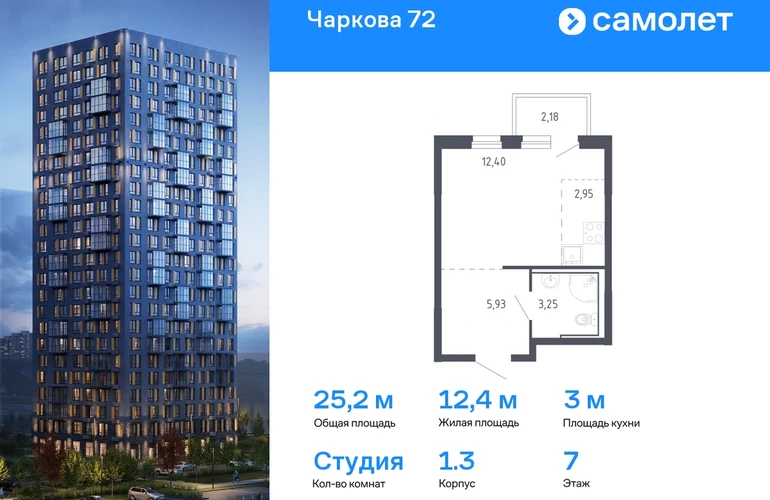 Строим кварталы для жизни с заботой о будущем. Предлагается квартира студия комфорт-класса 25,18 кв.м в корпусе 1.3 на 7 этаже, в ЖК «Чаркова 72» Квартира с предчистовой отделкой. Доступность дополнительных опций уточняйте у застройщика. Приобрести квартиру возможно по специальным акциям от застройщика, с текущими условиями акций можно ознакомиться в блоке «Акций». Цена динамическая и может отличаться, уточняйте актуальность у застройщика. Идеальное сочетание городского комфорта и размеренной жизни — квартал «Чаркова 72» на северо-востоке города. В дизайне 17-24-этажных домов с панорамными балконами нашли отражение нотки сибирской природы. От «Чаркова 72» удобно добираться до центра города — всего 17 минут пути. А в 2 минутах от дома находится Тобольский тракт. Для семейного отдыха отлично подойдет парк Гагарина — он находится в 7 минутах от квартала. В закрытых дворах тихо и уютно — все авто остались на одном из 4 многоуровневых паркингов, которые находятся за территорией квартала. Можно спокойно гулять по бульвару и заниматься йогой на спортивной площадке. На первых этажах домов — кафе и магазины. Рядом с проектом — детские сады и школы, городская поликлиника и МФЦ. Во всех квартирах есть выводы под кондиционеры, на подземных этажах — индивидуальные кладовые, на первых — места для хранения велосипедов и колясок. В квартирах можно выбрать варианты отделки: чистовая, черновая и улучшенная из материалов повышенного класса.#yan19-2r1770084#О застройщике