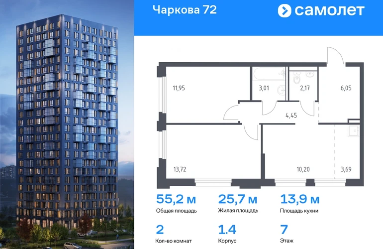 Предлагается 2-комнатная квартира комфорт-класса 55,24 кв.м в корпусе 1.4 на 7 этаже, в ЖК «Чаркова 72» Квартира с чистовой отделкой. Доступность дополнительных опций уточняйте у застройщика. Приобрести квартиру возможно по специальным акциям от застройщика, с текущими условиями акций можно ознакомиться в блоке “Акций”. Цена динамическая и может отличаться, уточняйте актуальность у застройщика. Идеальное сочетание городского комфорта и размеренной жизни — квартал «Чаркова 72» на северо-востоке города. В дизайне 17-24-этажных домов с панорамными балконами нашли отражение нотки сибирской природы. От «Чаркова 72» удобно добираться до центра города — всего 17 минут пути. А в 2 минутах от дома находится Тобольский тракт. Для семейного отдыха отлично подойдет парк Гагарина — он находится в 7 минутах от квартала. В закрытых дворах тихо и уютно — все авто остались на одном из 4 многоуровневых паркингов, которые находятся за территорией квартала. Можно спокойно гулять по бульвару и заниматься йогой на спортивной площадке. На первых этажах домов — кафе и магазины. Рядом с проектом — детские сады и школы, городская поликлиника и МФЦ. Во всех квартирах есть выводы под кондиционеры, на подземных этажах — индивидуальные кладовые, на первых — места для хранения велосипедов и колясок. В квартирах можно выбрать варианты отделки: чистовая, черновая и улучшенная из материалов повышенного класса.#yan19-2r1775626#О застройщике