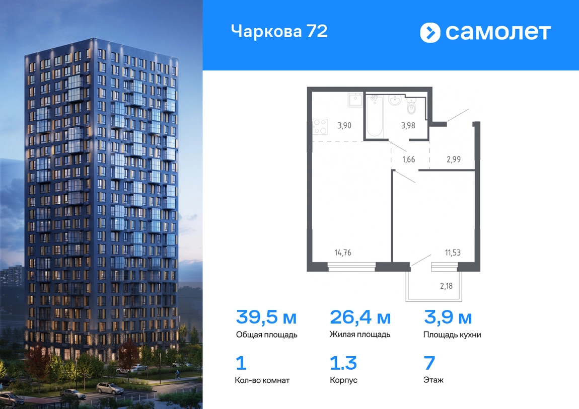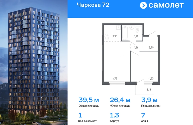 Строим кварталы для жизни с заботой о будущем. Предлагается 1-комнатная квартира комфорт-класса 39,47 кв.м в корпусе 1.3 на 7 этаже, в ЖК «Чаркова 72» Квартира с предчистовой отделкой. Доступность дополнительных опций уточняйте у застройщика. Приобрести квартиру возможно по специальным акциям от застройщика, с текущими условиями акций можно ознакомиться в блоке «Акций». Цена динамическая и может отличаться, уточняйте актуальность у застройщика. Идеальное сочетание городского комфорта и размеренной жизни — квартал «Чаркова 72» на северо-востоке города. В дизайне 17-24-этажных домов с панорамными балконами нашли отражение нотки сибирской природы. От «Чаркова 72» удобно добираться до центра города — всего 17 минут пути. А в 2 минутах от дома находится Тобольский тракт. Для семейного отдыха отлично подойдет парк Гагарина — он находится в 7 минутах от квартала. В закрытых дворах тихо и уютно — все авто остались на одном из 4 многоуровневых паркингов, которые находятся за территорией квартала. Можно спокойно гулять по бульвару и заниматься йогой на спортивной площадке. На первых этажах домов — кафе и магазины. Рядом с проектом — детские сады и школы, городская поликлиника и МФЦ. Во всех квартирах есть выводы под кондиционеры, на подземных этажах — индивидуальные кладовые, на первых — места для хранения велосипедов и колясок. В квартирах можно выбрать варианты отделки: чистовая, черновая и улучшенная из материалов повышенного класса.#yan19-2r1775632#О застройщике