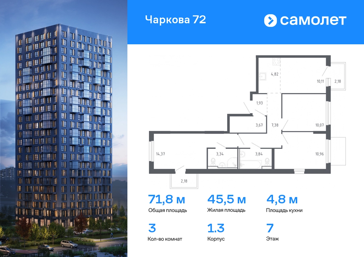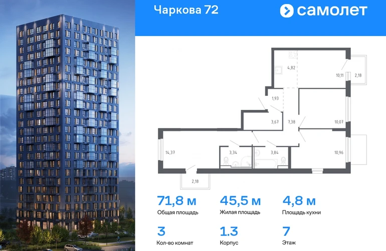 Предлагается 3-комнатная квартира комфорт-класса 71,79 кв.м в корпусе 1.3 на 7 этаже, в ЖК «Чаркова 72» Квартира с предчистовой отделкой. Доступность дополнительных опций уточняйте у застройщика. Приобрести квартиру возможно по специальным акциям от застройщика, с текущими условиями акций можно ознакомиться в блоке “Акций”. Цена динамическая и может отличаться, уточняйте актуальность у застройщика. Идеальное сочетание городского комфорта и размеренной жизни — квартал «Чаркова 72» на северо-востоке города. В дизайне 17-24-этажных домов с панорамными балконами нашли отражение нотки сибирской природы. От «Чаркова 72» удобно добираться до центра города — всего 17 минут пути. А в 2 минутах от дома находится Тобольский тракт. Для семейного отдыха отлично подойдет парк Гагарина — он находится в 7 минутах от квартала. В закрытых дворах тихо и уютно — все авто остались на одном из 4 многоуровневых паркингов, которые находятся за территорией квартала. Можно спокойно гулять по бульвару и заниматься йогой на спортивной площадке. На первых этажах домов — кафе и магазины. Рядом с проектом — детские сады и школы, городская поликлиника и МФЦ. Во всех квартирах есть выводы под кондиционеры, на подземных этажах — индивидуальные кладовые, на первых — места для хранения велосипедов и колясок. В квартирах можно выбрать варианты отделки: чистовая, черновая и улучшенная из материалов повышенного класса.#yan19-2r1775635#О застройщике