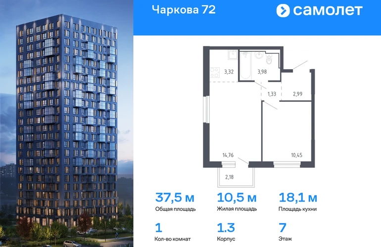Строим кварталы для жизни с заботой о будущем. Предлагается 1-комнатная квартира комфорт-класса 37,48 кв.м в корпусе 1.3 на 7 этаже, в ЖК «Чаркова 72» Квартира с предчистовой отделкой. Доступность дополнительных опций уточняйте у застройщика. Приобрести квартиру возможно по специальным акциям от застройщика, с текущими условиями акций можно ознакомиться в блоке «Акций». Цена динамическая и может отличаться, уточняйте актуальность у застройщика. Идеальное сочетание городского комфорта и размеренной жизни — квартал «Чаркова 72» на северо-востоке города. В дизайне 17-24-этажных домов с панорамными балконами нашли отражение нотки сибирской природы. От «Чаркова 72» удобно добираться до центра города — всего 17 минут пути. А в 2 минутах от дома находится Тобольский тракт. Для семейного отдыха отлично подойдет парк Гагарина — он находится в 7 минутах от квартала. В закрытых дворах тихо и уютно — все авто остались на одном из 4 многоуровневых паркингов, которые находятся за территорией квартала. Можно спокойно гулять по бульвару и заниматься йогой на спортивной площадке. На первых этажах домов — кафе и магазины. Рядом с проектом — детские сады и школы, городская поликлиника и МФЦ. Во всех квартирах есть выводы под кондиционеры, на подземных этажах — индивидуальные кладовые, на первых — места для хранения велосипедов и колясок. В квартирах можно выбрать варианты отделки: чистовая, черновая и улучшенная из материалов повышенного класса.#yan19-2r1778088#О застройщике
