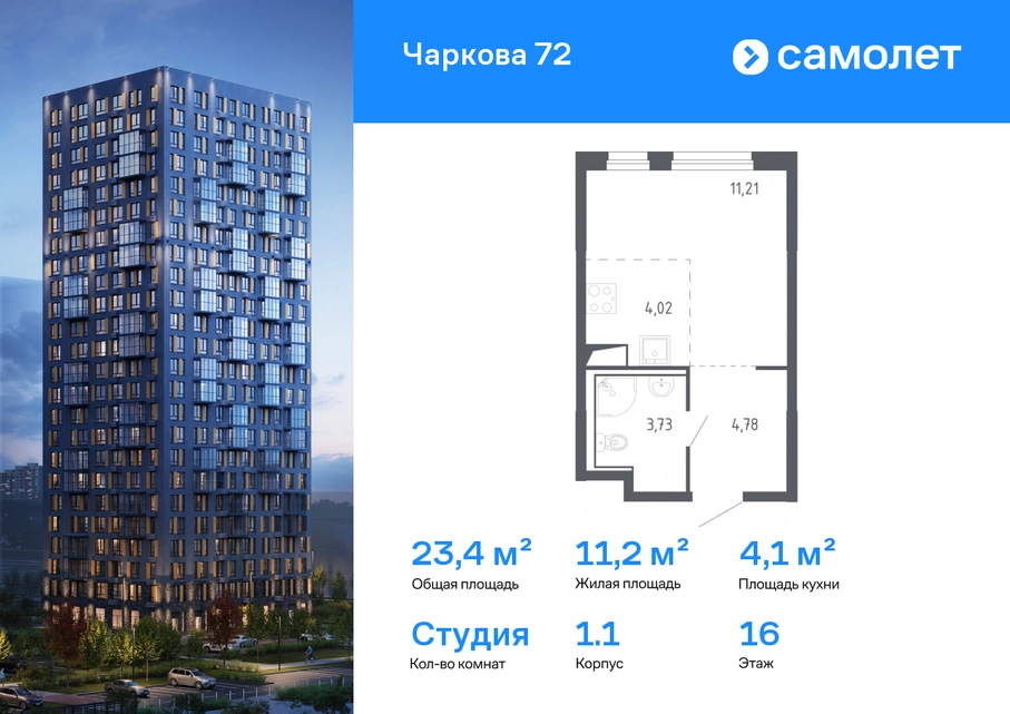 Строим кварталы для жизни с заботой о будущем. Предлагается квартира студия комфорт-класса 23,4 кв.м в корпусе 1.1 на 16 этаже, в ЖК «Чаркова 72» Квартира с чистовой отделкой. Доступность дополнительных опций уточняйте у застройщика. Приобрести квартиру возможно по специальным акциям от застройщика, с текущими условиями акций можно ознакомиться в блоке «Акций». Цена динамическая и может отличаться, уточняйте актуальность у застройщика. Идеальное сочетание городского комфорта и размеренной жизни — квартал «Чаркова 72» на северо-востоке города. В дизайне 17-24-этажных домов с панорамными балконами нашли отражение нотки сибирской природы. От «Чаркова 72» удобно добираться до центра города — всего 17 минут пути. А в 2 минутах от дома находится Тобольский тракт. Для семейного отдыха отлично подойдет парк Гагарина — он находится в 7 минутах от квартала. В закрытых дворах тихо и уютно — все авто остались на одном из 4 многоуровневых паркингов, которые находятся за территорией квартала. Можно спокойно гулять по бульвару и заниматься йогой на спортивной площадке. На первых этажах домов — кафе и магазины. Рядом с проектом — детские сады и школы, городская поликлиника и МФЦ. Во всех квартирах есть выводы под кондиционеры, на подземных этажах — индивидуальные кладовые, на первых — места для хранения велосипедов и колясок. В квартирах можно выбрать варианты отделки: чистовая, черновая и улучшенная из материалов повышенного класса.#yan19-2r1819397#О застройщике